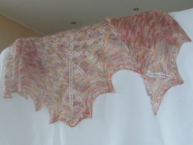 Gestern abend ist nun endlich mein heißgeliebtes Drops-Tuch fertig geworden. Am Montag brachte die Post die nachbestellte Wolle und ich konnte an den vergangenen Abenden die letzten paar Reihen stricken. Eben hab ich das gute Stück von den Stecknadeln befreit. Leider sind die Fotos bescheiden. Das Licht ist doof und meine Models sind noch in der Schule. Wenn mal wieder die Sonne scheint und der Garten wieder betretbar ist, sollte ich mal ne kleine Fotosession veranstalten.